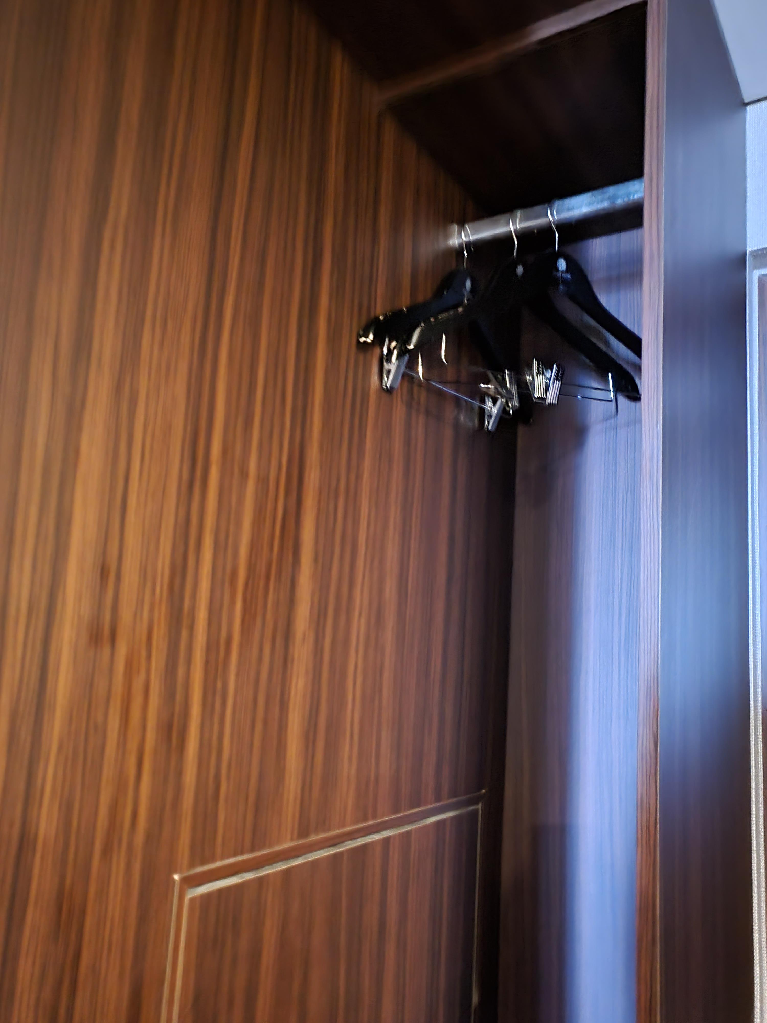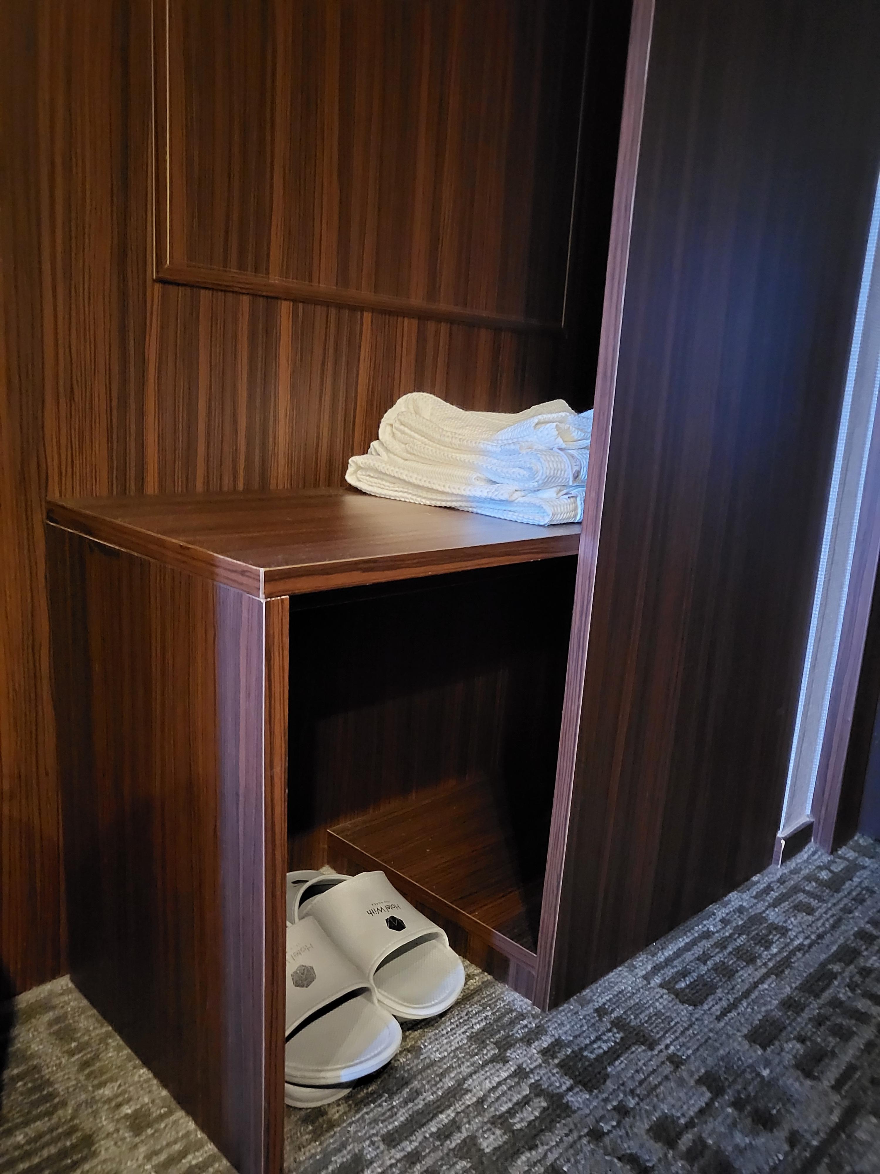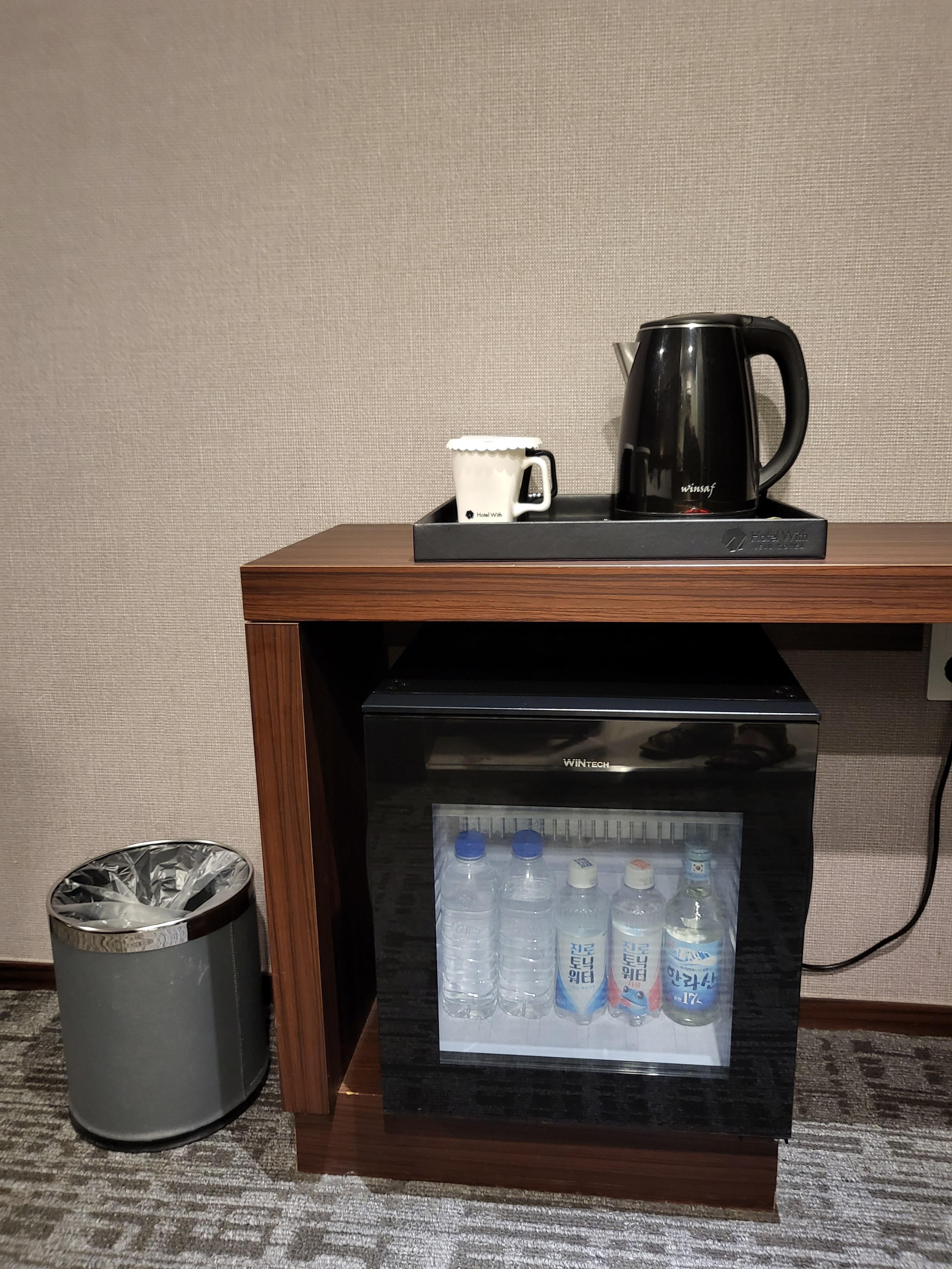 현관문 옆쪽 공간에는 옷을 걸어둘 수 있는 공간과 미니냉장고, 커피포트, 금고가 있었어요!