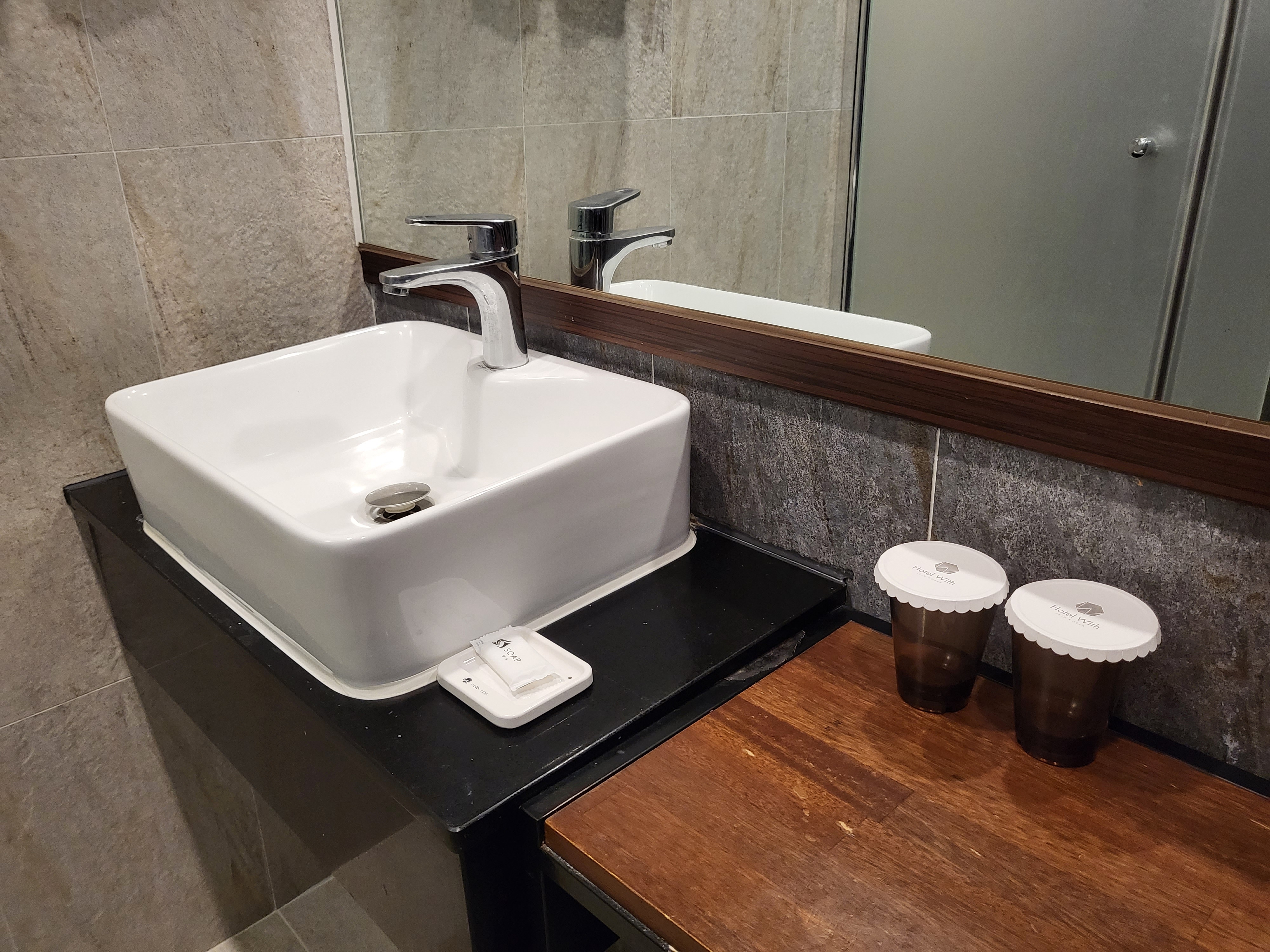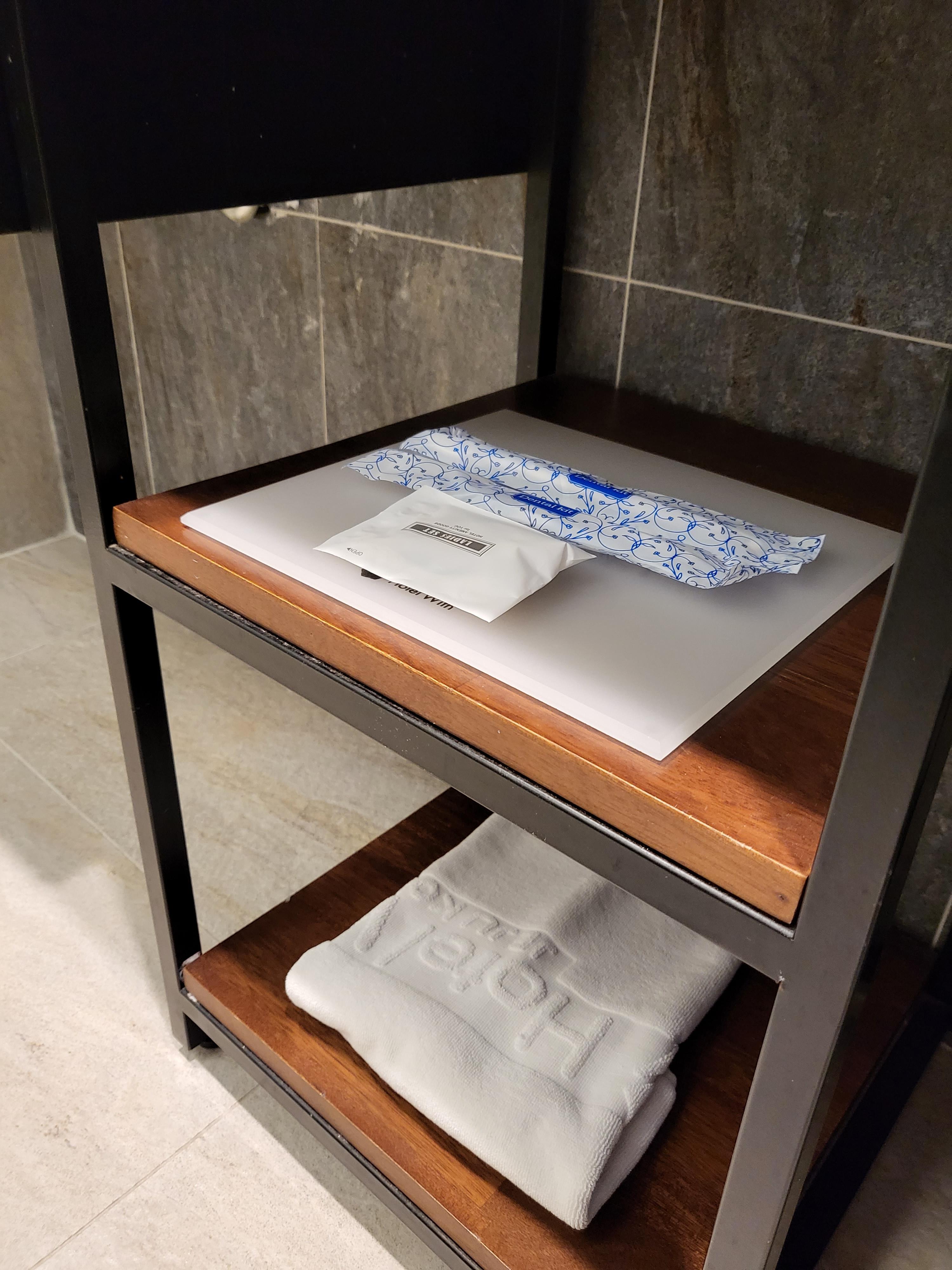 수건, 양치용 컵, 일회용 칫솔, 비누, 머리끈까지 모두 구비되어 있었습니다.