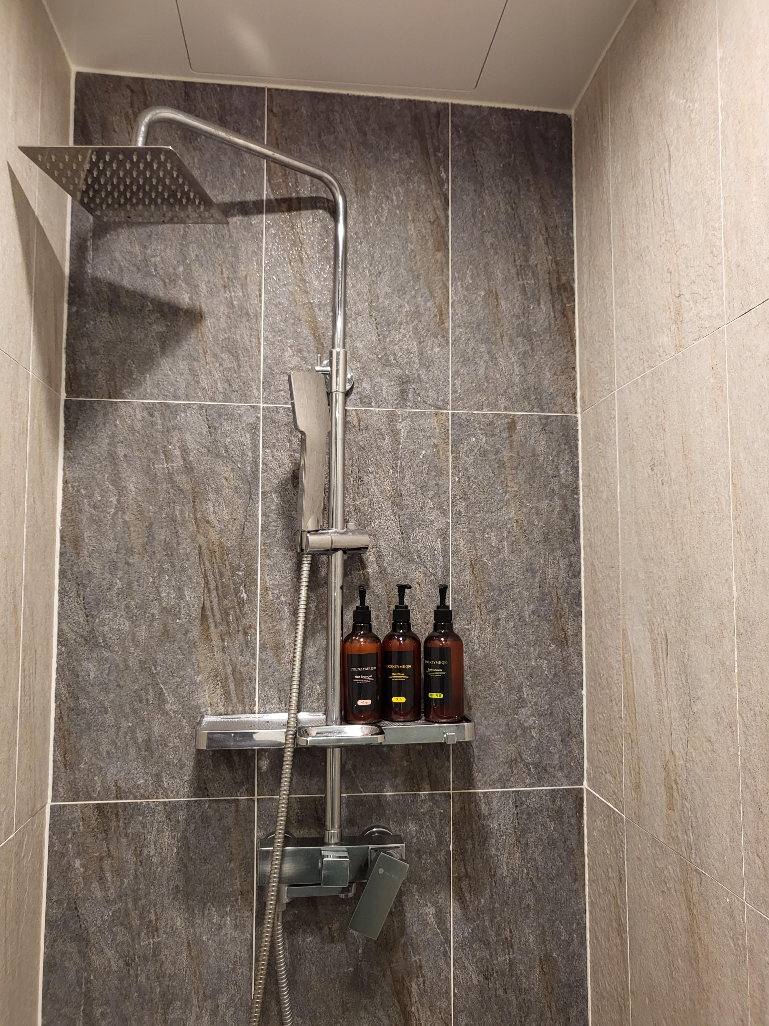 유리문 안쪽은 샤워실 입니다. 샤워실은 넓지는 않았는데, 저는 좁다고 느껴지지도 않았던 것 같아요